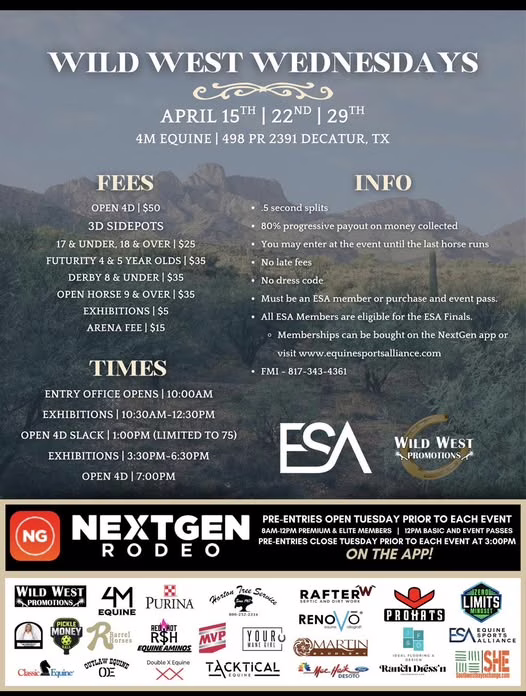 - 29 Apr 2026 10:00AM to 10:00PM WWP/ESA Wild West Wednesdays 4M Equine – 4/29 4M Equine Ranch